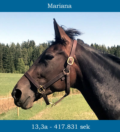 Mariana on oma kasvatti ja syntynyt 2013 Kanadassa. Tamma aloitti 2-vuotiaana lupaavasti, 8 ekaa starttia totosijoin 3-4-0 ja paras aika 13,3a.